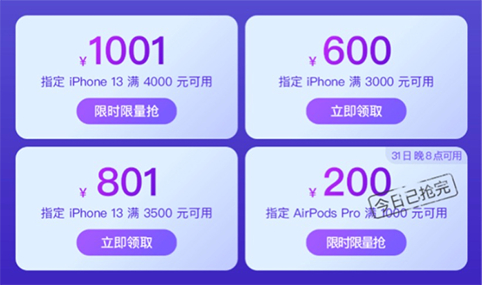 目前在京东Apple产品自营旗舰店,消费者在购买指定iPhone 13可限时领取满4000元减1001元、满3500元减801元大额券,购买指定iPhone领取满3000元减600元优惠券,更有指定AirPods Pro满1000减200等优惠券。此外,其他Apple产品也有超值优惠,感兴趣的小伙伴记得定好闹钟,领取优惠券后下单即可使用。