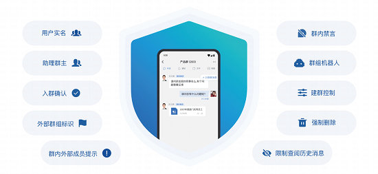 如今,蓝信也练就了“火眼金睛”,百万级的组织通讯录可将所有组织成员收录于通讯录内,蓝名片清晰显示组织成员的姓名、头像、部门、手机号、邮箱等标签,保证了所有组织成员身份的真实性。在蓝信工作群中,可以设置组织成员实名制、群内外部成员提示,群成员身份一目了然;想要进群需要群主进行相关审核和审批,且每个人进群组后,所有成员都会收到通知;支持强制删除、群内禁言、限制查阅历史消息的功能,确保工作信息的安全无虞。