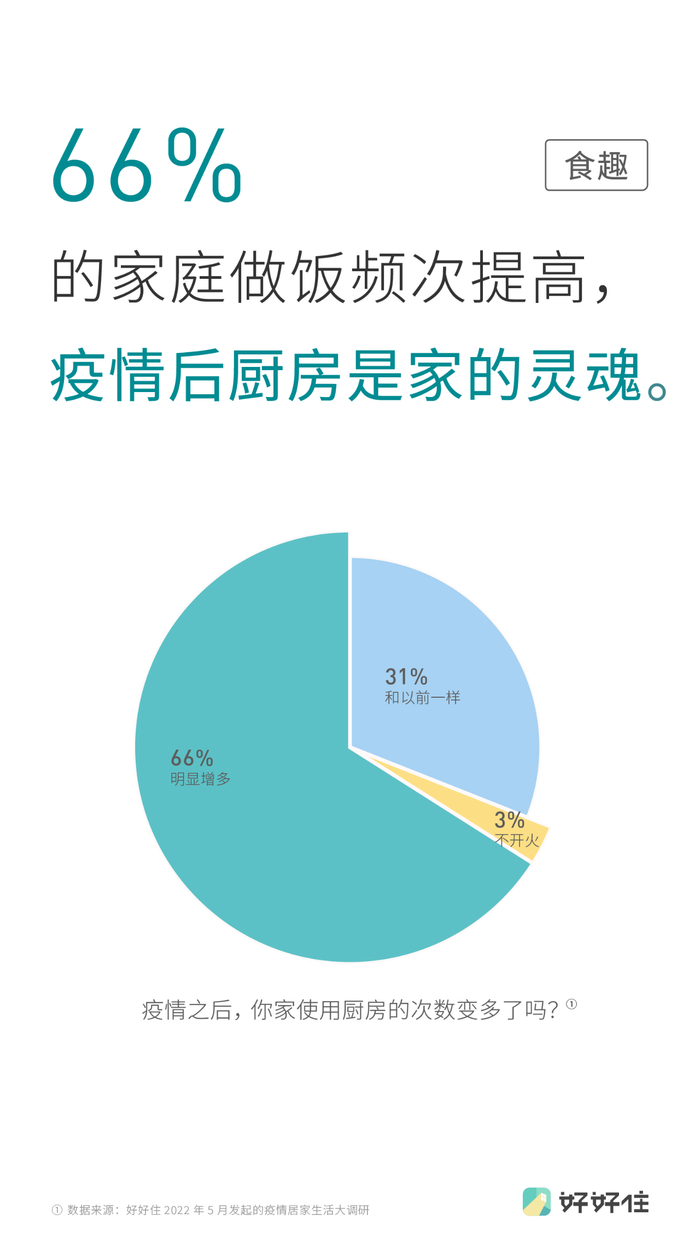 在好好分发布的这份涵盖四大趋势和14个关键词的趋势报告中,“食趣”成为非常重要的一个关键词。据好好住今年5月发起的一项关于疫情期间居家生活大调研,有66%的中国家庭在家做饭变得更频繁,72%的家庭每天要在厨房花两个小时以上的时间。