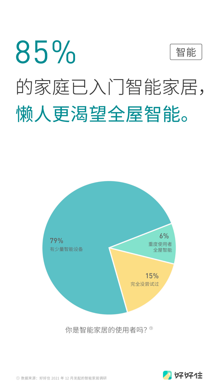 “智慧居住”趋势的关键词之一为“智能”,根据好好住的趋势报告,85%的中国家庭已经入门智能家居,平均10万元以内,是现阶段中国家庭能接受的智能家居预算。在这些人群中,41%的家庭渴望实现全屋智能。