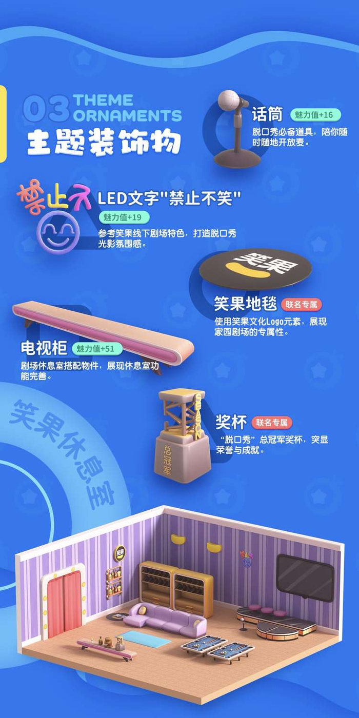 在虚拟社区的打造上,游戏还原了笑果脱口秀剧场休息室,剧场处处可见脱口秀元素,从“禁止大笑”的灯牌设计、随时随地来一场开放麦的话筒,到脱口秀总冠军奖杯等元素,细节满满地融入了年轻玩家喜欢的休闲游戏区。对局之后,玩家可以来到休息室小憩,和好友聊天互动,置身其中,也可以通过自创段子参与“每日一梗”环节,随时随地上演一场别开生面的开放麦,仿佛自身就是一个可以拯救所有不开心的脱口秀达人。