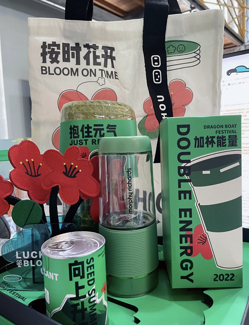 礼盒整体以环保和实用性为主,杜邦纸外包代替纸质礼盒注重绿色环保,以粽子手工皂代替以往的食品粽子,趣味性更强。另外还有打工人必备解压“三件套”:呼吁“反内卷”的打工人空调毯,职场黑话版蒸汽眼罩,用来做“续命良药”的咖啡壶,简直就是“午睡的好搭档,摸鱼的好法器”!