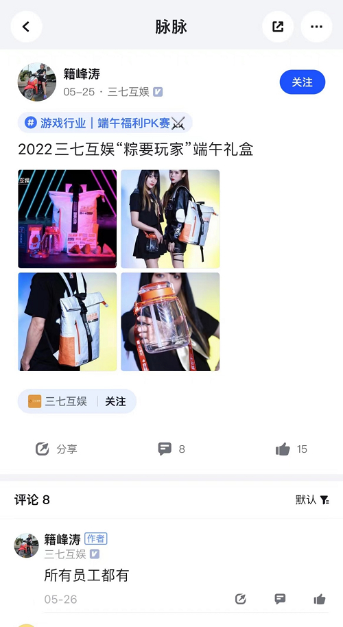这也是众多游戏厂商中最会整活的代表,三七互娱推出了“粽要玩家”主题的端午礼盒,将传统礼盒做成了背包样式,还配备了一个大容量水壶,独特的包装方式确实让人眼前一亮,让很多员工翘首以盼。