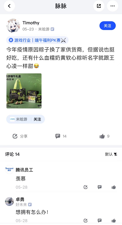 脉友也提到:“这次米哈游虽然更改了供货商,但据说也很好吃。还有什么血糯奶黄软心粽,听名字就跟王心凌一样甜。”让很多网友都表示羡慕不已。
