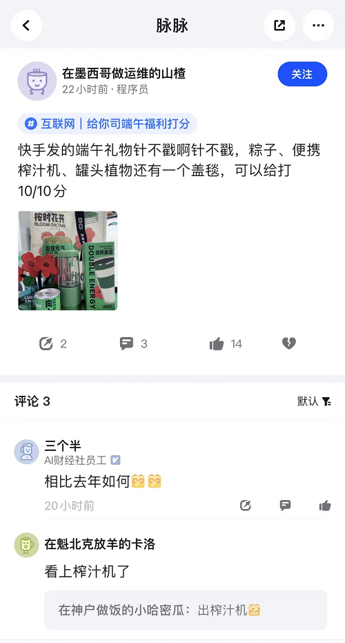 短视频巨头之一的快手今年发放的端午礼物也得到了员工的肯定。有网友就晒出了快手的端午礼盒,礼盒内的物品非常丰富,这位网友表示:“粽子、便携榨汁机、罐头植物还有一个盖毯,可以打10/10分。”相比其他公司,快手确实有想法,在评论区就有网友留言“看上榨汁机了”。
