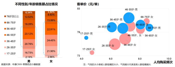 26-45岁的女性客群基数大,对药店销售贡献度高,但在客单和购买频次上仍有较大的待挖掘空间。46-65岁女性有着较高的客单,需进一步提升复购比例;
