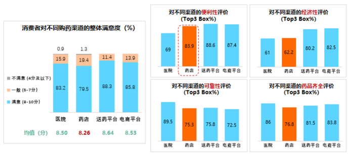 相比其他三个渠道,药店在便利性上有相对优势,能够满足消费者即时购药需求。但从经济性、可靠性和药品齐全度来看,药店购药体验有较大提升空间。