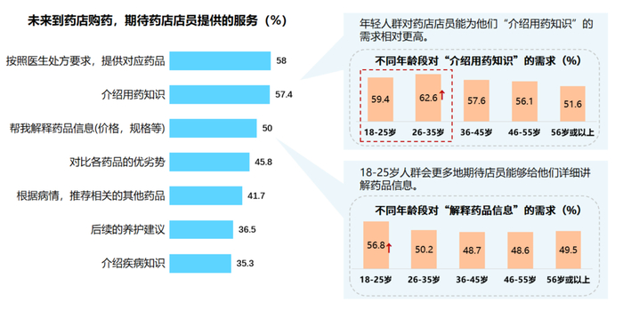 在中康CMH-消费者研究报告“期待药店店员提供的服务”调研中,有超50%的受访者表示,期待店员可以帮忙解释药品信息、介绍用药知识、按照医生处方要求提供对应药品。药店想要提升药店的服务质量,可以从专业用药知识入手,这对于留住顾客,尤其是年轻客群,有较大帮助。