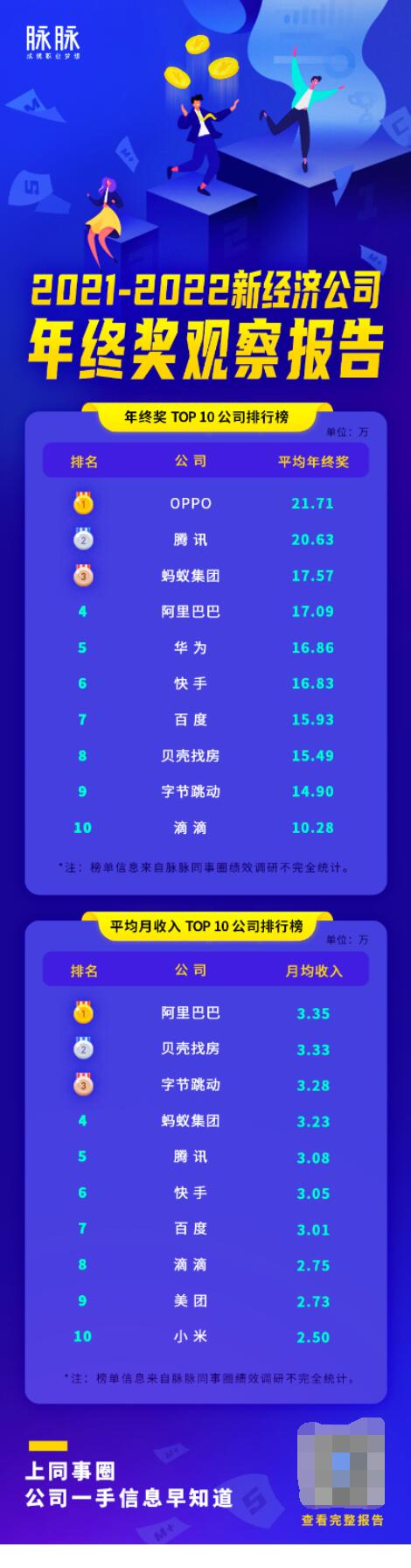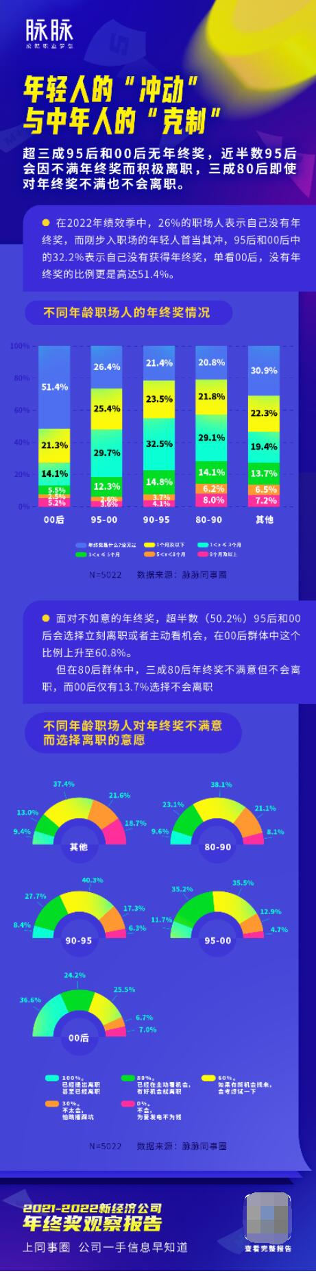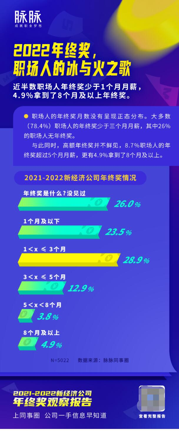 根据脉脉发布的《2021-2022新经济公司年终奖观察报告》显示,有4.9%的职场人拿到了8个月及以上年终奖,近半数职场人年终奖少于1个月月薪,近三成职场年终奖缩水二成以上,超三成的95后和00后没有年终奖。