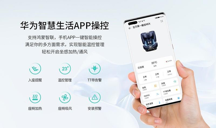 支持鸿蒙智联产品的推出,使安全座椅智能化互联体验升级,以Babyfirst与华为合作的两款儿童安全座椅JOY灵悦(0~7岁)及REX耀至(9个月~12岁)来说,通过华为鸿蒙智联可实现靠近发现与自动回连,达到迅速连接配网,秒连安全座椅设备,一键享服务的体验,相比繁琐的下载再配网方式来说,极大的提升了用户在使用中的便捷性,用户使用起来更轻松;并且手机侧具备自动告警感知功能,用户触达率更高,通过手机一键互联,可以监测座椅安装对错及安全座椅TT带告警功能,很大程度上改善了家长误安装带来的安全隐患问题;同时还可以实现智能温控管理,一键开启吸风式通风散热及座椅加热功能,无论是炎热夏季还是寒冷冬季,都能保证宝宝处于最佳舒适体感。