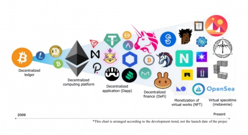 在宏观意义上,Web 3.0将是当前热议的元宇宙的底层网络架构,Web3.0的应用将打破Web2.0的生态圈界限,应用之间的复合性、组合性将不受限制,推动了“现实世界”与“虚拟世界”的融合,在分布式技术(区块链)的助力下,从去中心化点对点账本实验到去中心化智能合约平台,催生了无数的新型应用(Dapp),慢慢DeFi形成了数字世界里的“金融服务”,而NFT加速了资产上链。