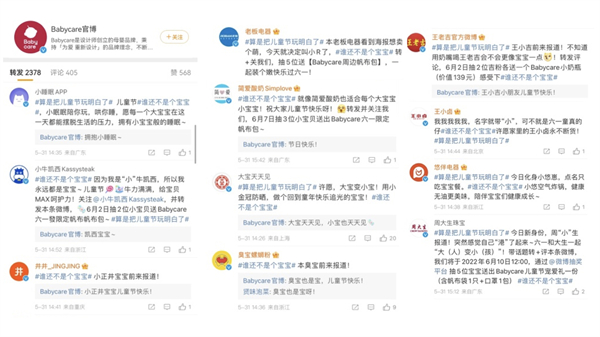 作为行业眼中的“异类”,Babycare在营销上一直非常低调。这样一个非常垂类的品牌却在这个六一前夕奇妙地破圈了。一条简单的“转发许愿池,变回宝宝”的微博引来了众多品牌的下场参与互动,其中不乏“王老吉”、“大白兔”、“大宝”、“万事利”这样耳熟能详、陪伴我们一同长大的国民品牌。很快,这场品牌们的“互撩”演变成了网友们的狂欢。大龄儿童们开始纷纷@其他品牌,许下儿童节的愿望。