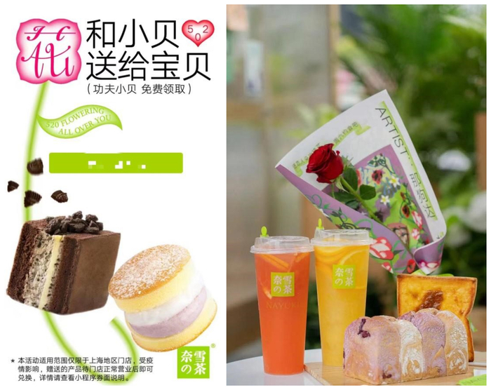 为助力上海复工复产,奈雪还为上海市民送出20多万份复工福利。奈雪的茶在520当天推出线上互动,上海市民参与线上“赠花”即可获赠点心券,2022年年内均可凭券兑换指定产品。数据显示,有超过20万用户参与此次活动。520活动期间,奈雪在线下还为上海团购消费者送出玫瑰花束近1500份,为上海加油打气。