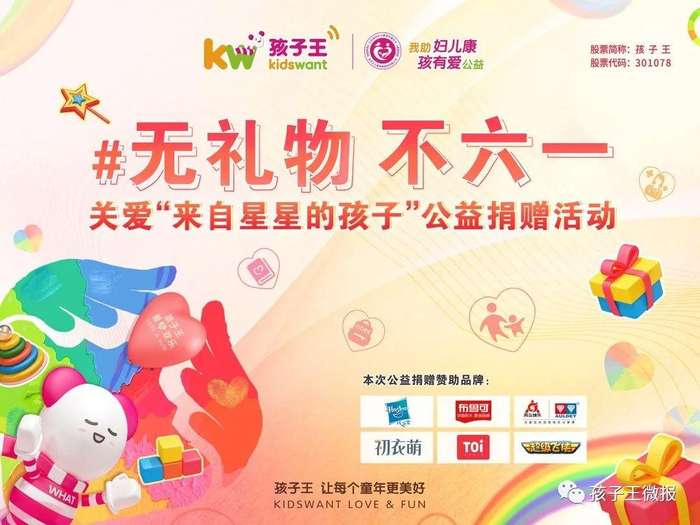 2020年开始,孩子王发起“我助妇儿康· 孩有爱”战略公益项目。截至目前,捐赠和筹集爱心款物近35,000,000元,在全国22个省市开展公益活动超万场,涵盖了好孕讲堂、公益社区行、安全防护、海姆利克急救主题讲座等10种公益形式,已使近1,000,000名妇女儿童受益。本次“关爱孤独症儿童”是孩有爱公益关爱特殊群体的践行体现,未来,孩子王还将汇聚更多力量,将爱与欢乐传递到更高更远的地方。