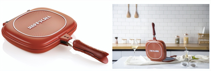这款印着巨大 logo的大红色HAPPYCALL双面锅是这个系列的经典款,前几年热潮的小巧双面锅的设计灵感就来源于此。