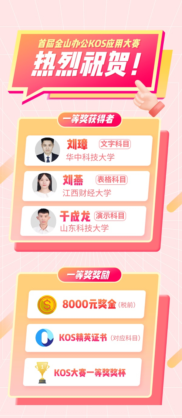 作为职业技能提升的实践机会,KOS大赛亦获得社会和高校广泛关注和支持,有超过4万人、2000所学校报名。经过激烈角逐,文字、表格、演示三个科目一、二、三等奖出炉。来自华中科技大学的刘璋、江西财经大学的刘燕、山东科技大学的于成龙,分别荣获文字科目、表格科目、演示科目一等奖。随着决赛结束,为期两个月的KOS大赛正式落下帷幕。