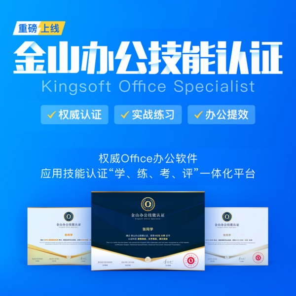 KOS(Kingsoft Office Specialist,金山办公技能认证)是由WPS官方推出的“学、练、考、评”一体化办公技能认证平台,为学生及职场人士等所有需要使用WPS Office软件的用户人群提供的办公技能人才培育及认证,对其掌握WPS Office软件应用技能的熟练程度和专业程度的权威测评,为用户职业选择、成长、晋升、面试等提供强有力的Office能力水平证明。