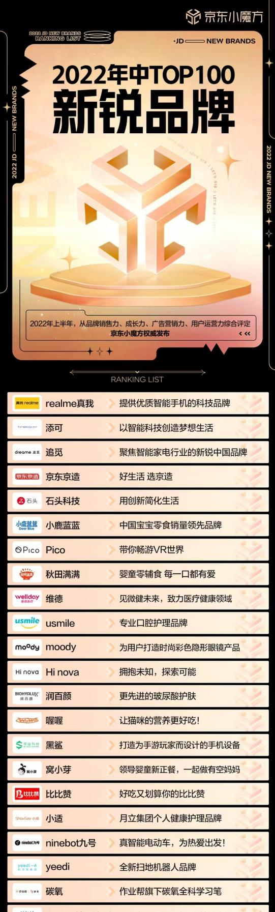 一直以来,作为京东新品首发阵地,京东小魔方将持续拓展新品赛道,布局新锐品牌的挖掘与扶持,助力新锐品牌加速成长。6月2日,京东小魔方发布了2022年中TOP100新锐品牌,覆盖家电、手机、食品、美妆、服饰、母婴、宠物、汽车等众多类目的100个新锐品牌上榜。数据显示,这100个新锐品牌中,超60个近一年整体增长超500%。