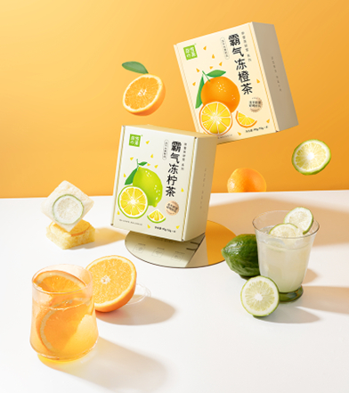 「霸气冻柠茶」用香水柠檬果片搭配乌龙茶粉,冲泡后兰花香气涌动,口感微酸沁爽。「霸气冻橙茶」用清甜橙子果片搭配茉莉花茶粉,遇水后橙子的鲜活感喷薄而出。两款冻干茶添加了门店同款果汁,以别样的形式将茶香与果香美妙融合,还原鲜活真果茶。