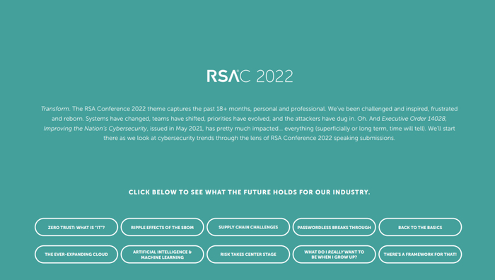 RSA大会每年都会有一个主题,本次大会的主题为Transform(转型)。提到转型,大家都不陌生,数字化转型是我国十四五规划的关键词。2022年的主题Transform(转型)是去年RSA大会主题Resilience(弹性)[3]的进一步延伸。弹性者,指的是小到企业面临网络攻击的应急和恢复,大到企业在疫情期间的存续和发展,这是转型的目的和意义。