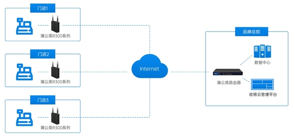 蒲公英方案部署简单、周期短,只需在总部部署蒲公英企业级路由器,在分散异地的各个门店部署蒲公英R300系列4G无线工业路由器,再通过蒲公英管理平台快速组建成一个虚拟局域网络,即可实现品牌总部与各门店之间收银系统的互联。