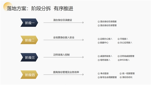 在企业最关注的落地环节,MeConnect建议客户分为四个阶段有序落地:混合身份目录建设,全场景身份接入安全,泛终端准入控制,身份管理及业务效率提升,助力企业数字化转型循序渐进,最终提升业务协作效率。