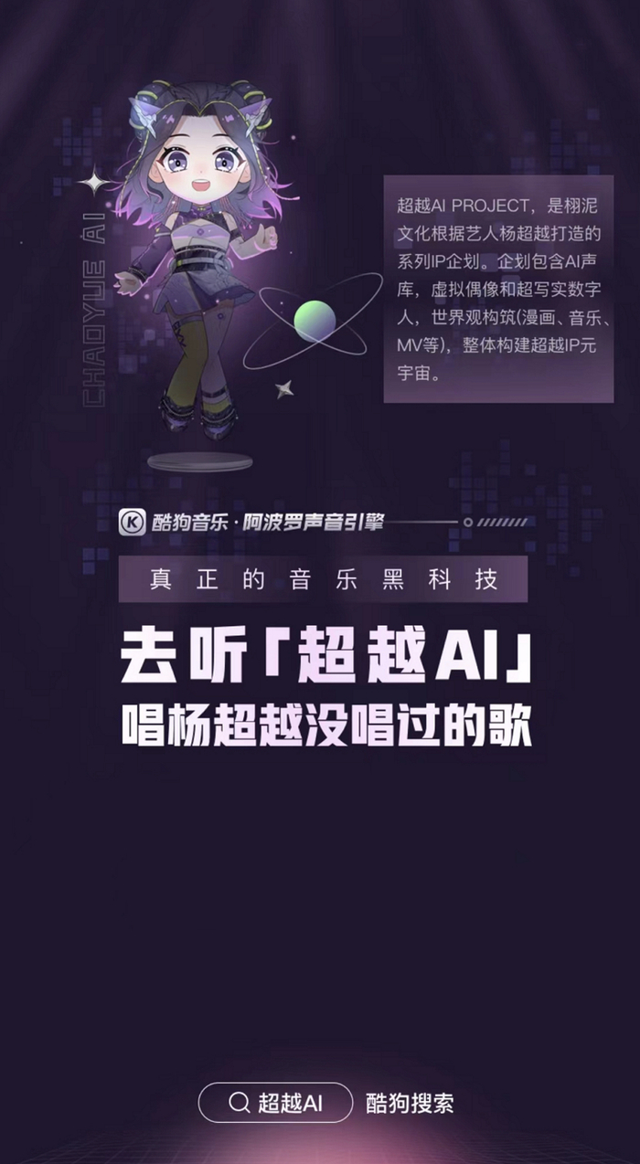 【超越AI PROJECT】是酷狗音乐携手栩泥文化根据杨超越本人打造的系列IP企划,包含了:AI声库、虚拟偶像、漫画、MV等。酷狗AI歌手,则是该企划的首个项目,用户进入“超越AI”订阅、听歌、抽盲盒,还可在社区论坛票选自己喜欢的歌曲,让“超越AI”唱给你听。