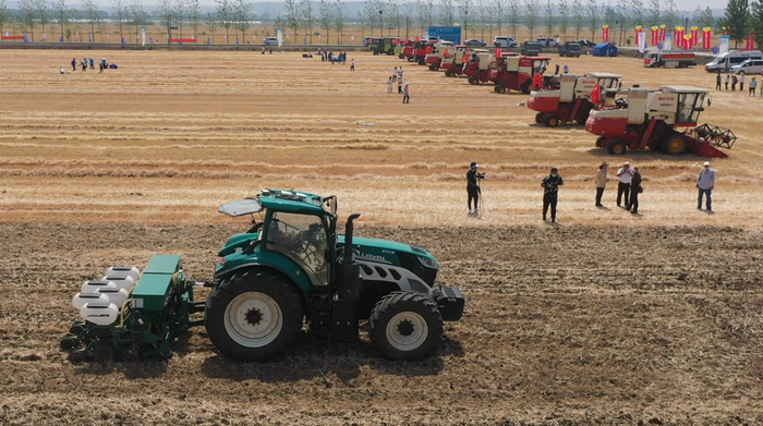 机收减损大比武结束后,由无人驾驶雷沃P7000智能拖拉机搭载雷沃大豆玉米带状复合气吸式免耕精量播种机进行无人作业演示,完美展示了4行大豆2行玉米同播作业效果。通过此款产品能够轻松实现“一田双收”,即玉米产量基本不减产,还能增收一季大豆,演示现场得到了与会嘉宾的一致认可。