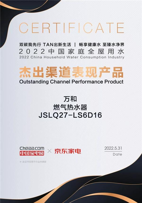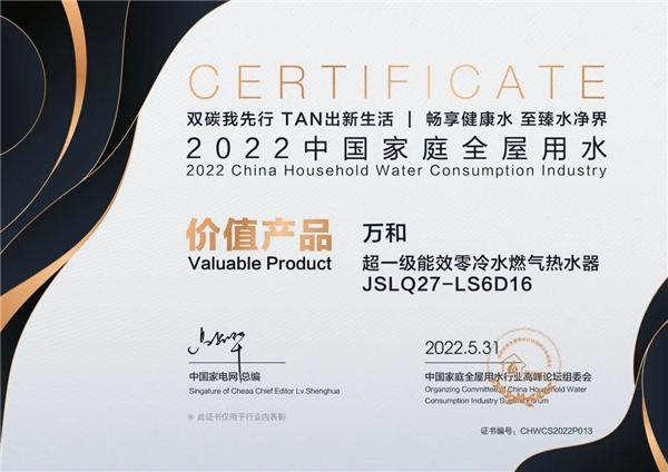而针对现在消费者用水健康需求的不断增长,5月31日,由中国家用电器协会指导、中国家电网主办的“双碳我先行 TAN出新生活 畅享健康水 至臻水世界”2022中国家庭全屋用水高峰论坛于线上举行,本次活动组委会还对表现优异的企业和产品颁发了一系列奖项。广东万和新电气股份有限公司旗下品牌“万和”被授予“双碳践行,绿色品牌”,并获得热水器产品类“行业贡献奖”。万和旗下产品智控双屏零冷水燃气热水器JSQ37-20ML3、超一级能效零冷水燃气热水器JSLQ27-LS6D16获得“价值产品”殊荣,燃气热水器JSLQ27-LS6D16被评为“杰出渠道表现产品”。
