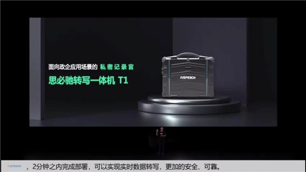本次发布会的第二款产品:思必驰转写一体机T1,作为私密记录官,拥有便携式笔记本的外观设计,全离线部署,可以实现实时速记转写,更加安全可靠。不仅满足对安全性要求较高的场景下的文字记录转写,针对大型封闭会议,通过字幕投屏功能,将重要的发言信息以文字形式展现给所有观众。