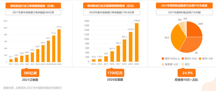后疫情时代下的中国,更高效的消费体验已成为消费者日常生活的首选。如今,社会消费已经进入“懒人时代”。根据数据显示,2020年我国外卖的订单量已经达到171.2亿,全国交易规模达到8352亿元,并保持持续增长。我国外卖用户规模已接近5亿人,万物到家服务需求暴增,作为到家服务最重要的基础设施,“即时配送”将迎来黄金发展的十年。
