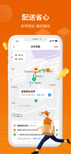「蜂骑快送」以“快速、稳定、准时、省钱”服务B端作为切入点,为B端配送,最终送至消费者手中。致力于为B端商家降低运营成本,提供充足的运力资源,提高配送效率。商家可以多渠道选择配送方式,价格清晰透明,同时「蜂骑快送」组建驻店运力为商家解决自配送订单配送履约需求。此外,转化C端用户带动多元化消费服务。基于LBS地图位置化服务,提供帮买-帮送-帮取-帮办等一系列服务。