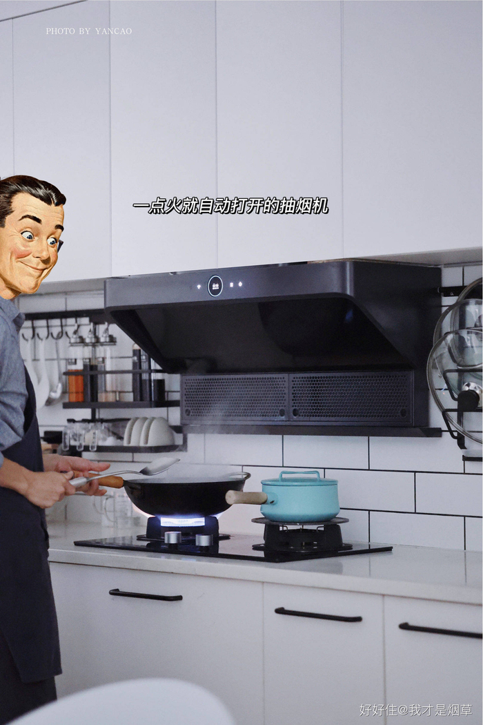 一点火就自动打开的油烟机,可以和燃气灶联动。开火的同时,油烟机自动升降打开,侧吸+顶吸一起工作,无论调节风力还是开关机,直接解放双手。