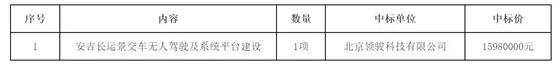 据5月19日安吉县公共资源交易中心显示,领骏科技成为“浙江安吉长运汽车运输有限公司采购项目(安吉长云景交车无人驾驶及系统平台建设项目)”中标单位,中标金额为1598万元。