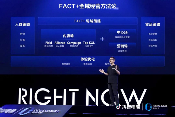 在今年的抖音电商生态大会上,抖音电商发布了“FACT+全域经营方法论”,这次的策略升级就是为了更贴近用户的消费习惯。这套升级后的理论,进一步完善了此前抖音电商强调的“内容场”(短视频、直播),同时也补充加强了“中心场”(搜索和商城),从而把“货找人”和“人找货”这两个消费路径进行了协同。