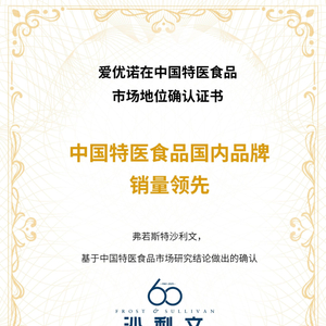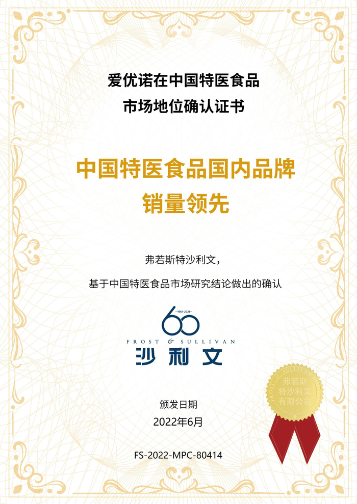 近日,全球权威咨询公司弗若斯特沙利文(Frost & Sullivan,以下简称“沙利文”)基于对中国特医食品市场长期的深度调研与行业研究,经确认授予爱优诺品牌在中国特医食品市场地位确认证书,认定爱优诺为“中国特医食品国内品牌销量领先”。