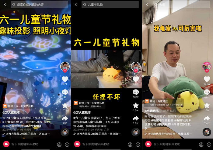 话题挑战赛#有被儿童节礼物秀到#反响热烈,不仅吸引众多用户晒出自己的儿童节礼物,也推动海量商家参与种草,借势节日热度实现多维扩散,成功打出爆款商品。其中,新锐品牌万火旗舰店玩转创意灯具内容锁定用户的关注力,成功向抖音用户种草星空灯、拍拍灯等新颖的儿童节礼物。通过日常的经营摸索,优趣优品打通了“短视频深度种草+商家自播高效成交”的成熟经营链路,活动期间,优趣优品单支“龟蜜”短视频的曝光量和点击量就突破5000万,为品牌直播和店铺访问引爆流量,店铺日均交易额实现7倍增长,突破商家店铺成交水位。