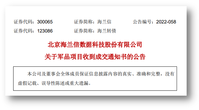 6月7日,北京海兰信公司发布公告称,公司参与了军队某部组织的XX竞争性谈判采购项目,并于近日取得某部采购机构下发的《成交通知书》,成交金额超过2.8亿元,占公司2021年度营业收入的31.11%!