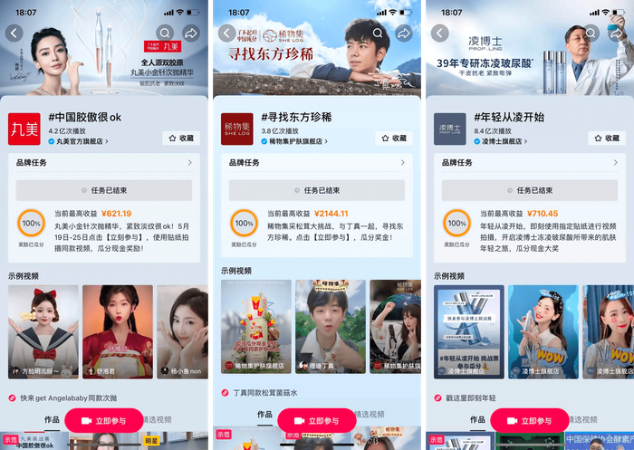 在统一的“了不起的中国成分”话题下,各大品牌结合自家产品的独特卖点及差异化优势,打造品牌专属子话题和品牌任务等互动玩法。