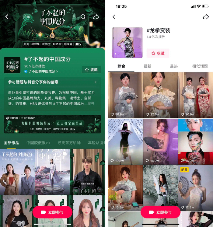 抖音主话题#了不起的中国成分 播放量在5月19日官宣日当天便破亿,当前播放量已达20.5亿+。井胧、娄艺潇等50+明星及美妆护肤达人为IP打call,打造#龙拳变装 挑战赛,抖音播放量1.4亿+,登陆抖音挑战榜19位、热榜51位 ,引发话题讨论热潮。