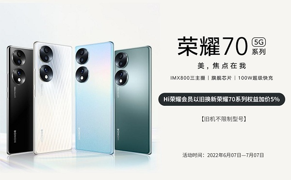 自2022年6月7日起,荣耀70系列陆续在线上线下平台全面开售,消费者可前往荣耀体验店、荣耀商城、京东和天猫等渠道购买。其中,荣耀体验店联合闪回收推出为期一个月的以旧换新活动,而且不限机型均可参与,可谓诚意十足。