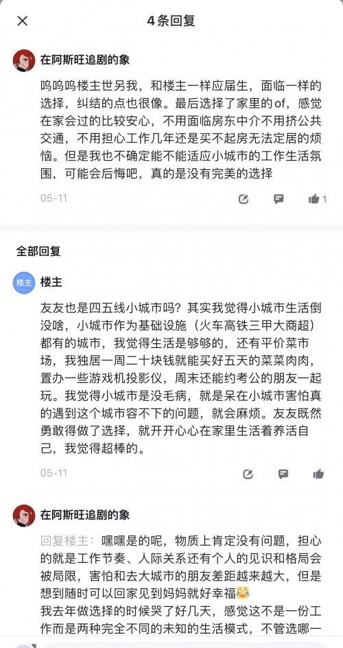 小象也是今年的应届生,在面临同样的抉择时她选择回家乡发展。亲朋好友在一起的生活让她感到安心,不用面对房东、中介,不用挤公交,没有买不起房、无法定居的烦恼。但她也不确定自己是否能适应小城市的工作节奏和生活氛围。