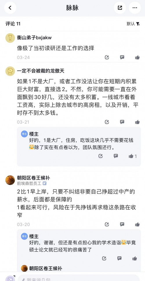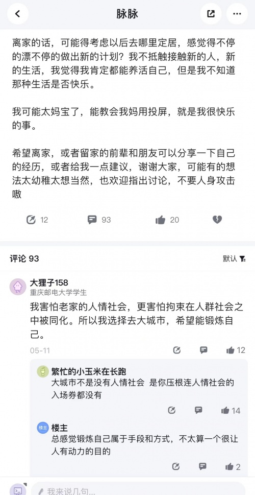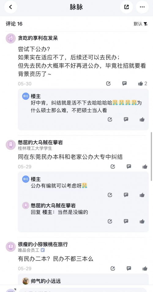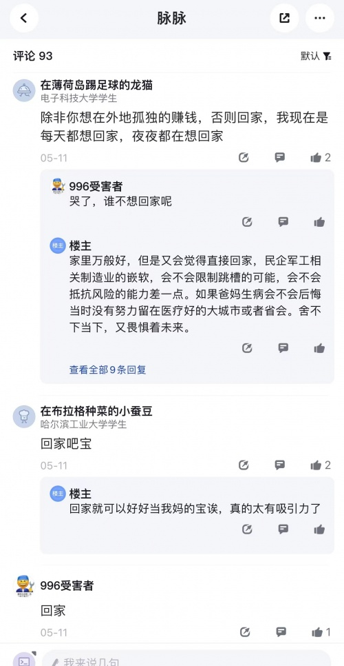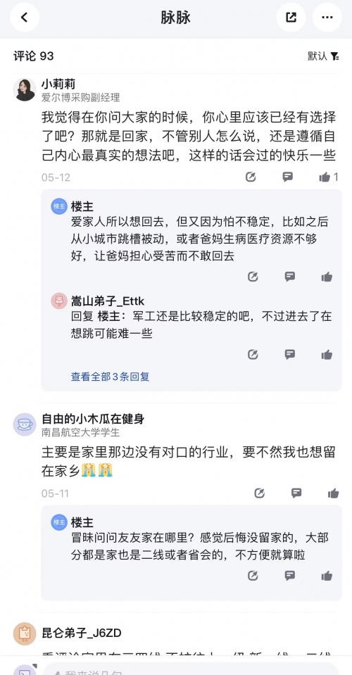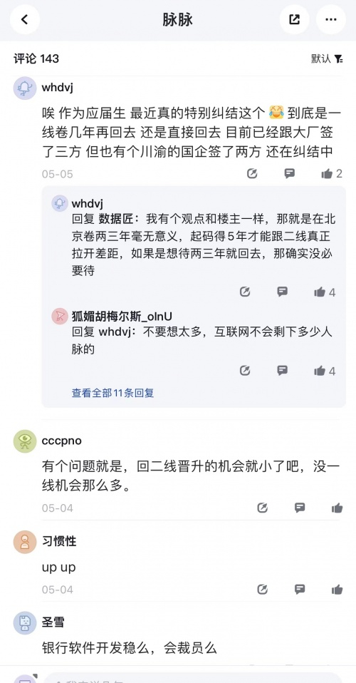 在这个毕业季,此类分享在脉脉上引得不少应届生前来提问,有做嵌入式岗位的应届生咨询应选择一线的私企还是新一线的国企,也有应届生与大厂签三方后纠结是否该直接回川渝的国企工作。几位去年的应届生表示,真希望自己早看到这个帖子,也不至于像现在一样,在一线城市拼搏一年后因为各种原因要回老家发展,打乱了职业发展规划也浪费了应届生身份。