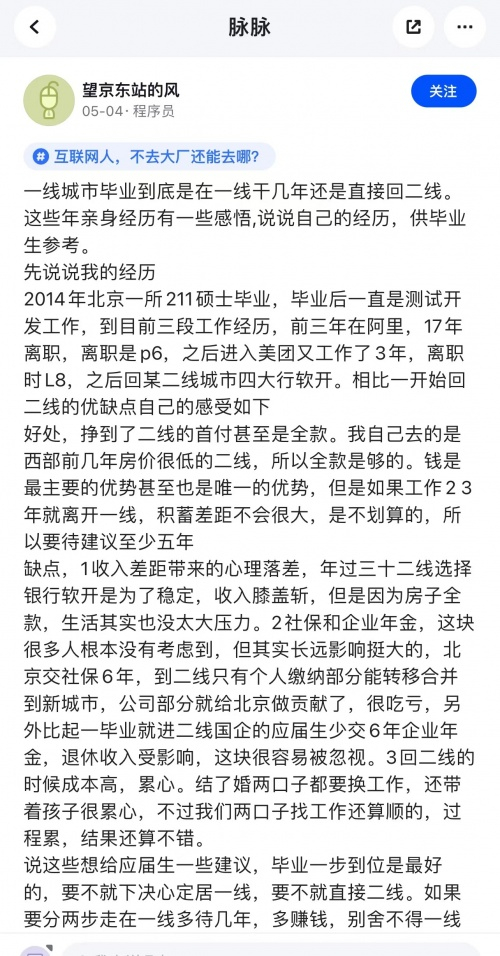作为程序员相关专业的毕业生,一线城市和大厂之外的归宿在哪里?在脉脉上也有前辈分享亲身经历,供毕业生参考。