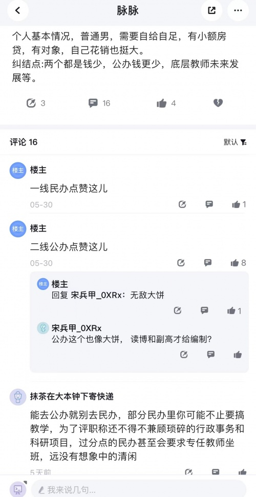 另一份offer是二线城市的公办本科院校,每月工资拿到手6k,虽说是二线城市,但吃喝消费几乎等同一线,而且不允许教师兼职。学校许诺的大饼是未来读博或副高可以给编制,一般不会被炒鱿鱼。但可能的风险是他这届是最后一年招聘硕士,怕自己进去就是鄙视链的底层。