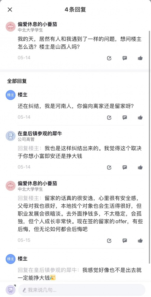 中北大学学生小番茄也表示赞同,回到家乡会让她觉得安逸、有安全感,但职业发展会很暗淡。到大城市挣钱多、个人成长非常快,但也不太稳定、会有孤独感。
