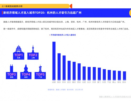 据脉脉发布的《乘势而上 人才流动与迁徙2022》报告显示,杭州已经位列新经济领域人才流入前五名的城市,而且对新经济人才的吸引力远超广州。同时,新一线城市中,成都和重庆的新经济人才吸引力领跑西南地区,南京和苏州也成为华东地区人才聚集地,武汉和西安分别是华中和华北地区人才热门去处。