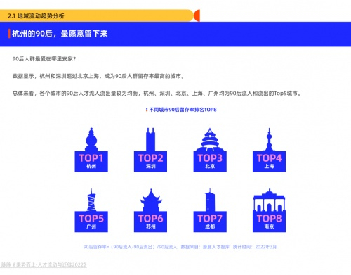 特别是杭州,已经成为Z世代人才留存率最高的城市,此外苏州、成都、南京等新一线城市也在吸引着大批年轻人才流入。