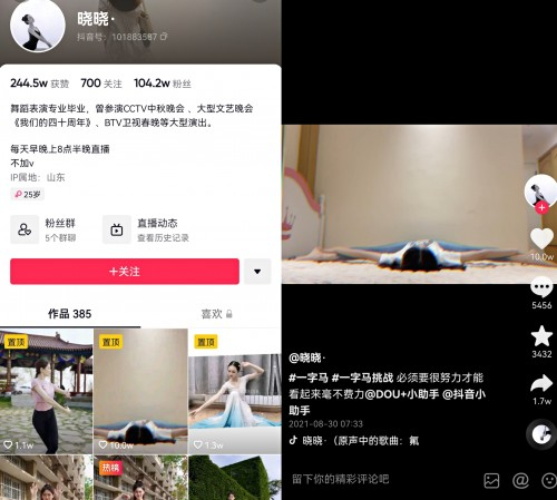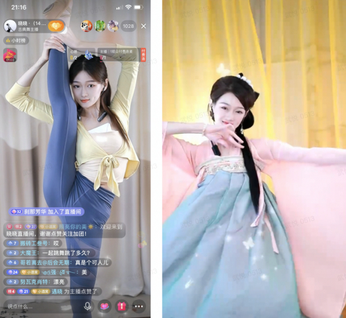 近两年,晓晓开始在抖音直播,时间固定在早上和晚上两个时段,每次持续约2-3小时。她通常会表演古典舞、维族舞、当代舞等等,《醉倾城》《燕无歇》《半生雪 》等舞蹈是晓晓跳得最多的。“表情管理,基本功,舞姿决定了表现力。”晓晓说,你得让大家看出你的功底,让大家喜欢。凭借自身的努力和专业表演,她的抖音账号@晓晓· 积累了粉丝达104万,获得点赞超过240万。