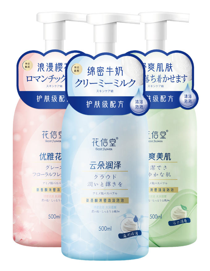 花信堂氨基酸沐浴泡泡产品,懒人福音,无需起泡工具,无需浴缸,站着就能享受泡泡浴,护肤级配方,像呵护脸一样呵护身体肌肤。特别添加氨基酸表活,深层洁净的同时又照顾了你想要温和的小心思;蕴含多重氨基酸,给肌肤补充“能量”。泡泡类产品与皮肤接触面广,相较而言,产生的刺激性更小,对敏感肌更友好,净肤的同时可以实现护肤,洗完以后皮肤嫩嫩的、润润的,非常适合长期使用。